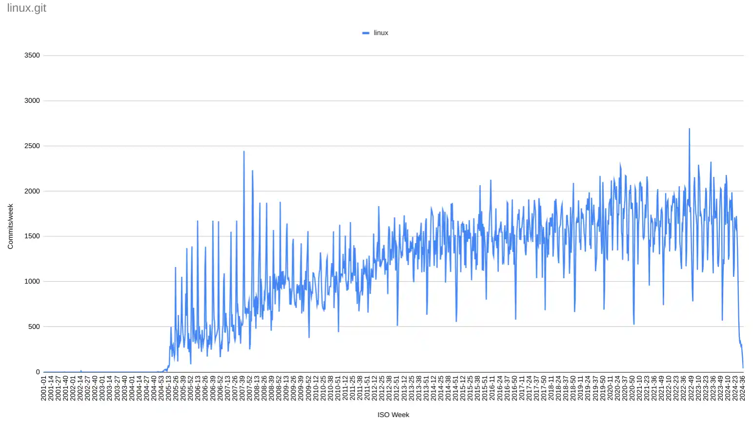 Since the Linux kernel uses a merge workflow, merge commits are the equivalent of a PR. If you count only merge commits, the contribution rate is about 130 per week. It’s the red line in this graph. It’s about 20 changes per day, that’s a lot.